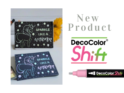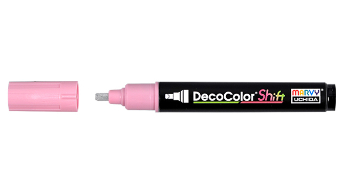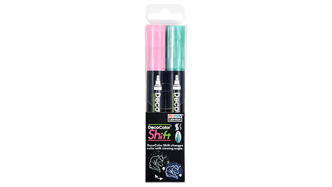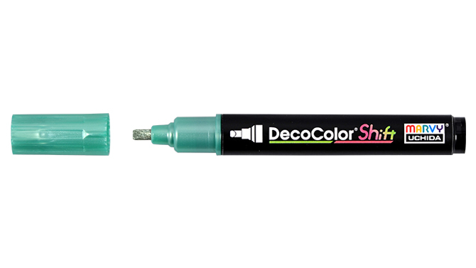 DecoColor Shift wird durch eine einzigartige Tinte erzeugt. Es erscheint je nach Betrachtungswinkel in unterschiedlichen Farben und kann sowohl auf saugfähigen als auch auf nicht saugfähigen Oberflächen geschrieben werden.