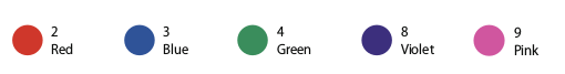 2 Red; 3 Blue; 4 Green; 8 Violet; 9 Pink